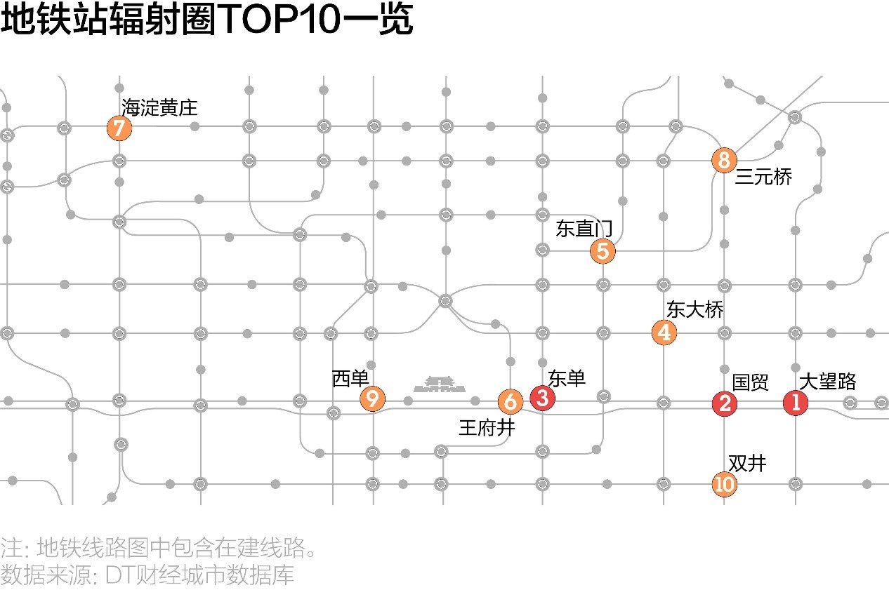在DT財(cái)經(jīng)《報(bào)告》對北京405個(gè)地鐵站輻射圈的綜合排名中,位于朝陽區(qū)的大望路站奪得第一,國貿(mào)、東單、東大橋、東直門、王府井、海淀黃莊、三元橋、西單與雙井站分列二至十名。