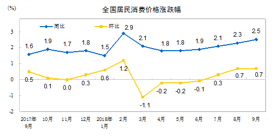 央廣網北京10月16日消息 國家統計局今日發布的數據顯示,2018年9月份,全國居民消費價格同比上漲2.5%,漲幅為近7個月新高。其中,城市上漲2.4%,農村上漲2.5%;食品價格上漲3.6%,非食品價格上漲2.2%;消費品價格上漲2.7%,服務價格上漲2.1%。1-9月平均,全國居民消費價格比去年同期上漲2.1%。