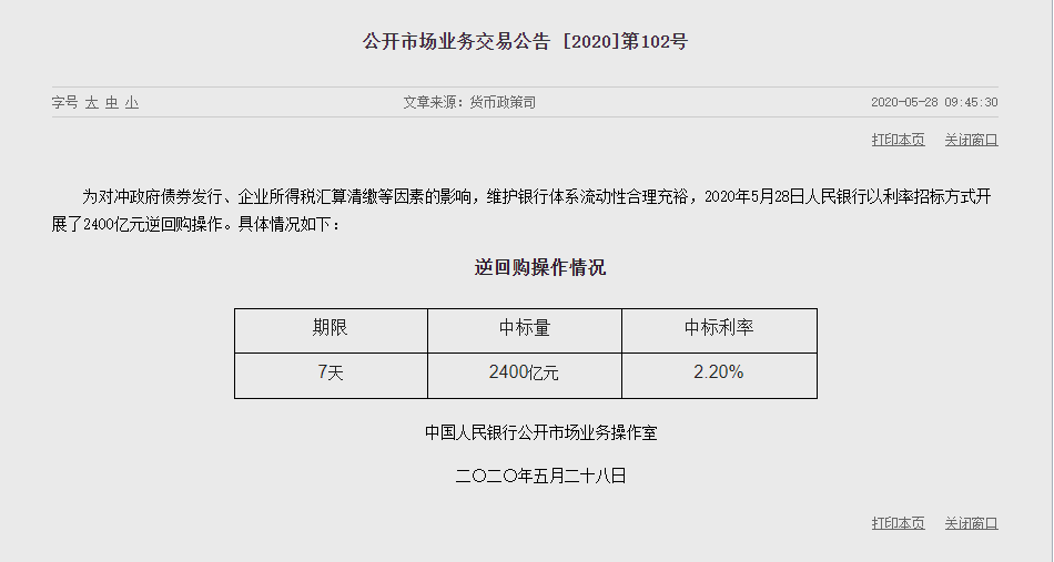 央行解釋稱,開展2400億元逆回購操作是為對沖政府債券發行、企業所得稅匯算清繳等因素的影響,維護銀行體系流動性合理充裕。此次中標利率依然與上次持平,仍為2.20%,期限為7天。