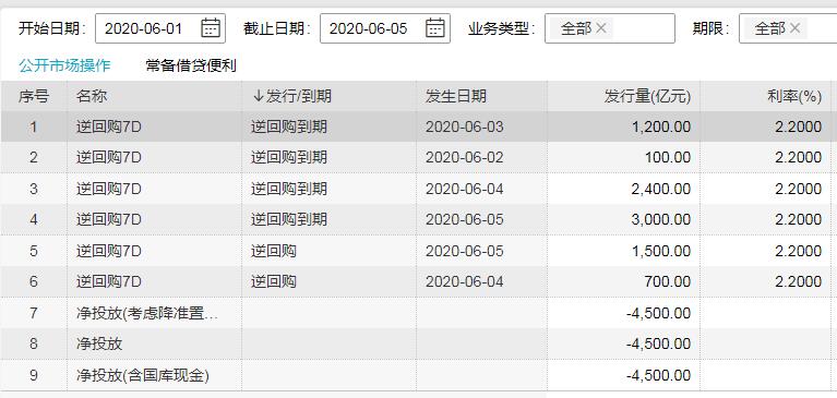 6月4日,央行為對沖公開市場逆回購到期和政府債券發行繳款等因素的影響,維護銀行體系流動性合理充裕,以利率招標方式開展了700億元逆回購操作,中標利為2.2%。