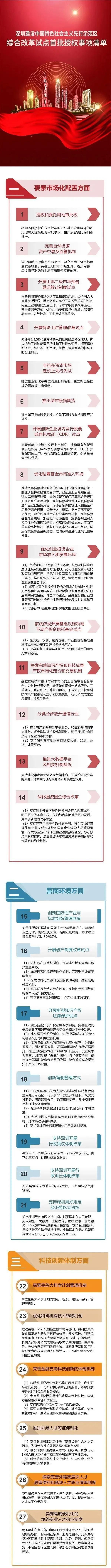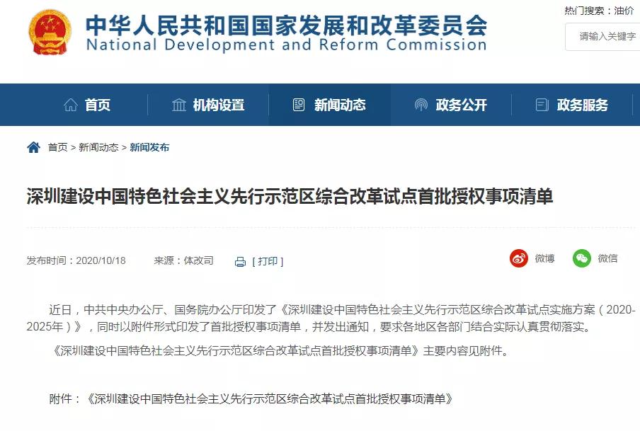 據國家發改委網站10月18日正式發布的《深圳建設中國特色社會主義先行示范區綜合改革試點首批授權事項清單》顯示,首批授權事項清單共有六大類40條。