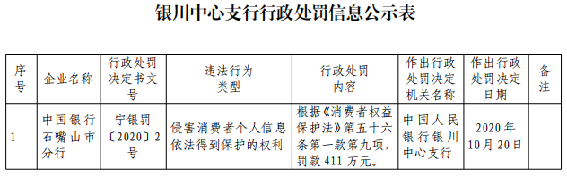 記者關注到,根據央行銀川中心支行行政處罰信息公示表顯示,因中國銀行石嘴山市分行侵害消費者個人信息依法得到保護的權利,監管部門依據《消費者權益保護法》第五十六條第一款第九項,對其作出了罰款411萬元的處罰。