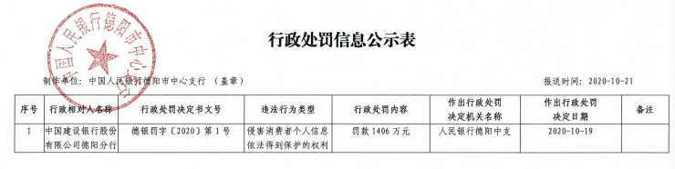 而根據21日披露的央行德陽中支行政處罰信息公示表顯示,建設銀行德陽分行因侵害消費者個人信息依法得到保護的權利,被監管部門罰款1406萬元。