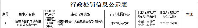 此外,建設銀行婁底分行同樣是因為侵害消費者個人信息依法得到保護的權利,被監管部門罰款533萬元。