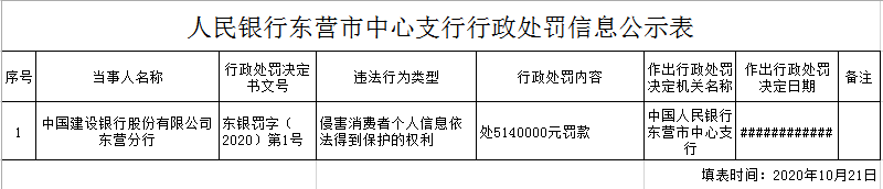 而根據央行東營市中心支行行政處罰信息公示表,建設銀行東營分行被監管部門處以罰款514萬元。