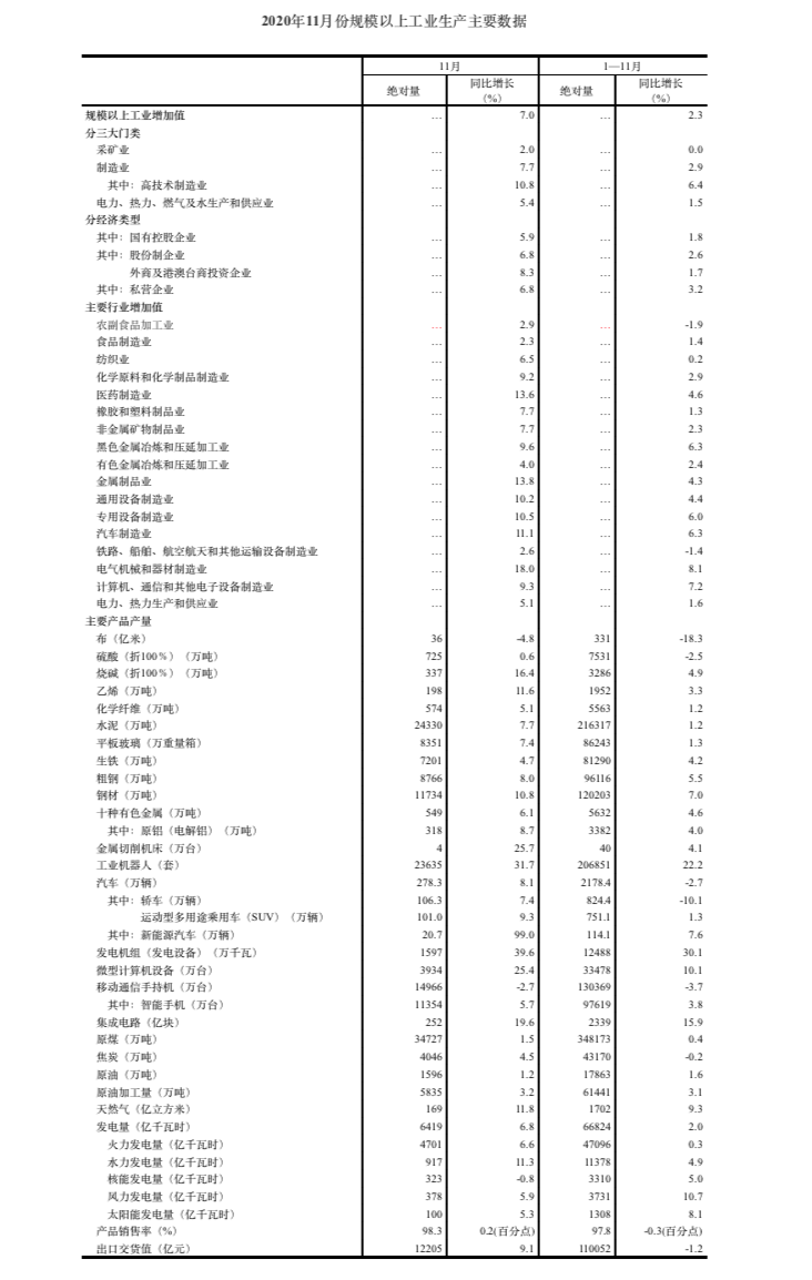 分三大門類看,11月份,采礦業(yè)增加值同比增長2.0%,增速較10月份放緩1.5個百分點(diǎn);制造業(yè)增長7.7%,加快0.2個百分點(diǎn);電力、熱力、燃?xì)饧八a(chǎn)和供應(yīng)業(yè)增長5.4%,加快1.4個百分點(diǎn)。