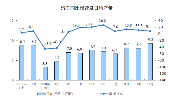 分行業(yè)看,11月份,41個大類行業(yè)中有34個行業(yè)增加值保持同比增長。農(nóng)副食品加工業(yè)增長2.9%,紡織業(yè)增長6.5%,化學(xué)原料和化學(xué)制品制造業(yè)增長9.2%,非金屬礦物制品業(yè)增長7.7%,黑色金屬冶煉和壓延加工業(yè)增長9.6%,有色金屬冶煉和壓延加工業(yè)增長4.0%,通用設(shè)備制造業(yè)增長10.2%,專用設(shè)備制造業(yè)增長10.5%,汽車制造業(yè)增長11.1%,鐵路、船舶、航空航天和其他運(yùn)輸設(shè)備制造業(yè)增長2.6%,電氣機(jī)械和器材制造業(yè)增長18.0%,計(jì)算機(jī)、通信和其他電子設(shè)備制造業(yè)增長9.3%,電力、熱力生產(chǎn)和供應(yīng)業(yè)增長5.1%。