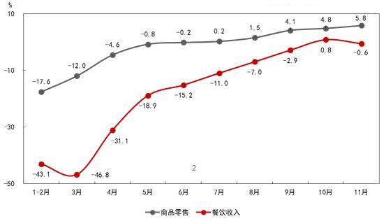 圖2 2020年各月商品零售和餐飲收入增速