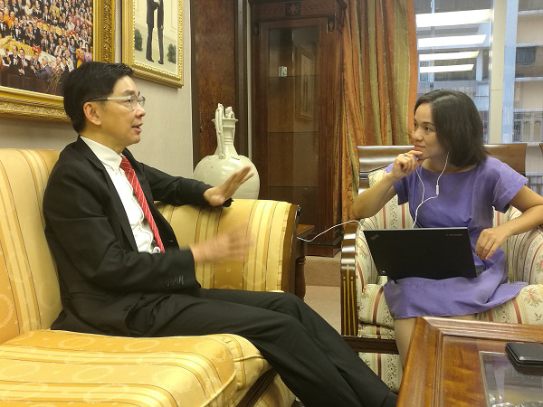 香港中華廠商聯(lián)合會(huì)會(huì)長(zhǎng)李秀恒(左)在香港接受了經(jīng)濟(jì)之聲記者馮雅(右)的專訪