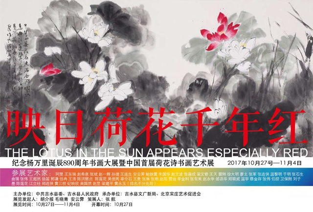 央廣網(wǎng)北京11月1日消息(記者劉思強(qiáng))2017年10月27日,為紀(jì)念楊萬里誕辰890周年,映日荷花千年紅書畫展在江西省吉水縣開展。該展由中共吉水縣委、吉水縣人民政府主辦,吉水縣文廣新局、北京宋莊藝術(shù)促進(jìn)會(huì)展承辦,展覽由胡介報(bào)、毛曉青、安云霽發(fā)起,張航策展。