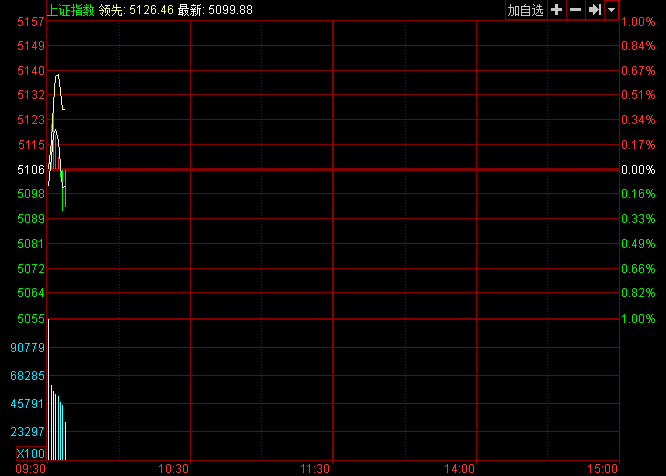 央廣網北京6月11日消息 據經濟之聲《交易實況》報道,周四早盤,兩市開盤漲跌不一,滬指報5101.44點,跌4.60點,跌幅0.09%,深成指報17692.90點,漲15.33點,漲幅0.09%,創業板報3843.98點,漲9.28點,漲幅0.24%。