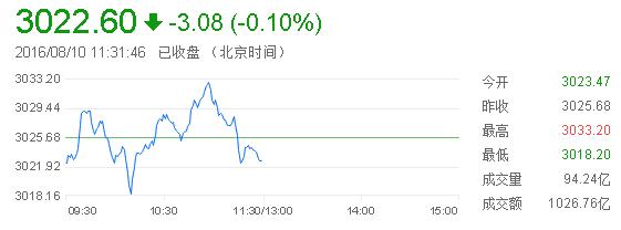 截止午間收盤,滬指報3022.60點,跌0.10%;創業板跌0.38%。