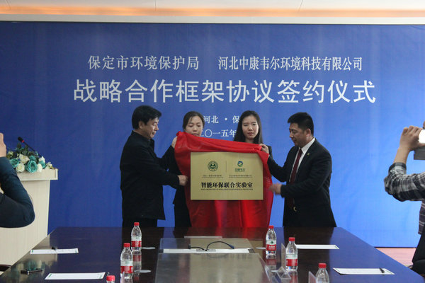 保定市環保局局長肖寶元(左)、中康韋爾總經理陳龍(右)分別代表雙方在戰略合作框架協議書上簽字并為“智能環保聯合實驗室”揭牌。