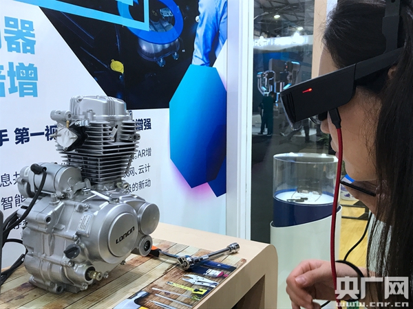 在亮風(fēng)臺公司的展臺前,一個摩托車發(fā)動機格外引人注目。現(xiàn)場工作人員任崇斌介紹,維修人員工作時戴上亮風(fēng)臺AR眼鏡,摩托車發(fā)動機的產(chǎn)品信息、零部件結(jié)構(gòu)就能清晰地疊加在現(xiàn)實場景之上。“我們可以在現(xiàn)實中疊加顯示它的內(nèi)部結(jié)構(gòu)和工作原理,可以選擇各個模塊讓它告訴我們每個零部件的名字。如果在維修的過程中遇到了問題,可以申請遠程協(xié)助。這些全都是戴著眼鏡在操作,可以達到解放雙手的目的。”