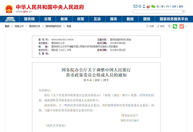 央廣網北京3月23日消息(記者蔣勇)據中央廣播電視總臺經濟之聲《天下財經》報道,國務院辦公廳近日發布通知,同意中國社會科學院國家高端智庫首席專家蔡昉、中國國際經濟交流中心副理事長王一鳴擔任貨幣政策委員會委員,中國發展研究基金會副理事長劉世錦繼續擔任貨幣政策委員會委員,中國人民大學校長劉偉、清華大學金融與發展研究中心主任馬駿不再擔任貨幣政策委員會委員職務。