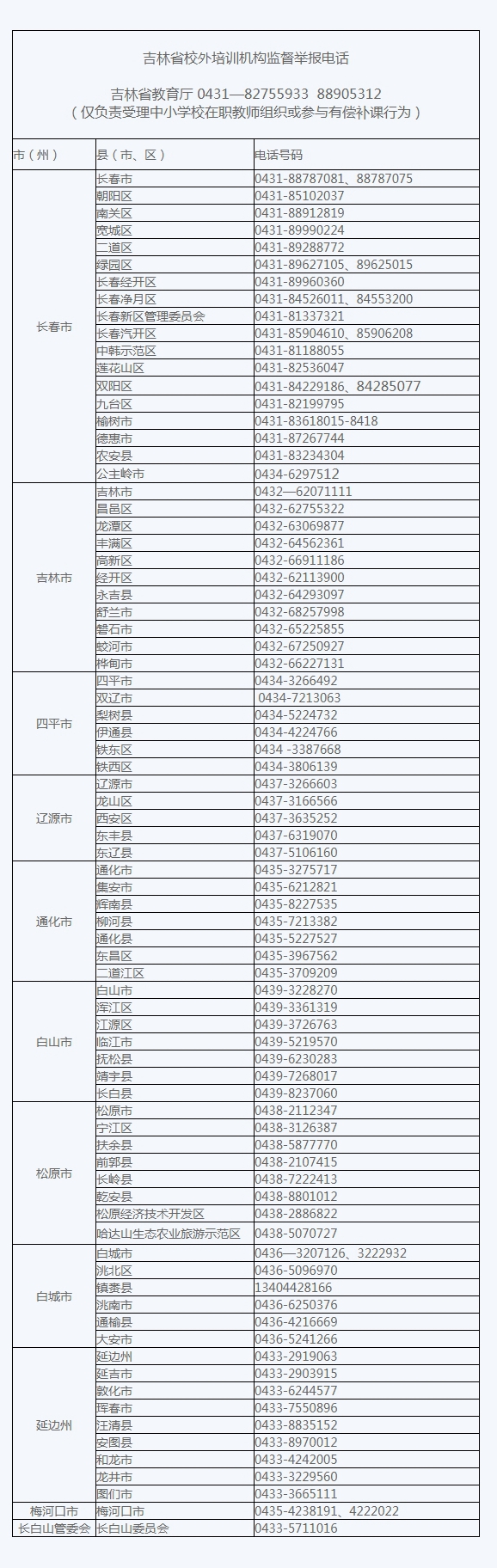 央廣網長春8月26日消息(記者 郭東隅)為持續規范校外培訓,廣泛發揮社會監督作用,近日,吉林省教育廳將省、市、縣教育行政部門監督舉報電話向社會公布。如發現校外培訓機構或中小學校在職教師有以下行為,請實名舉報。