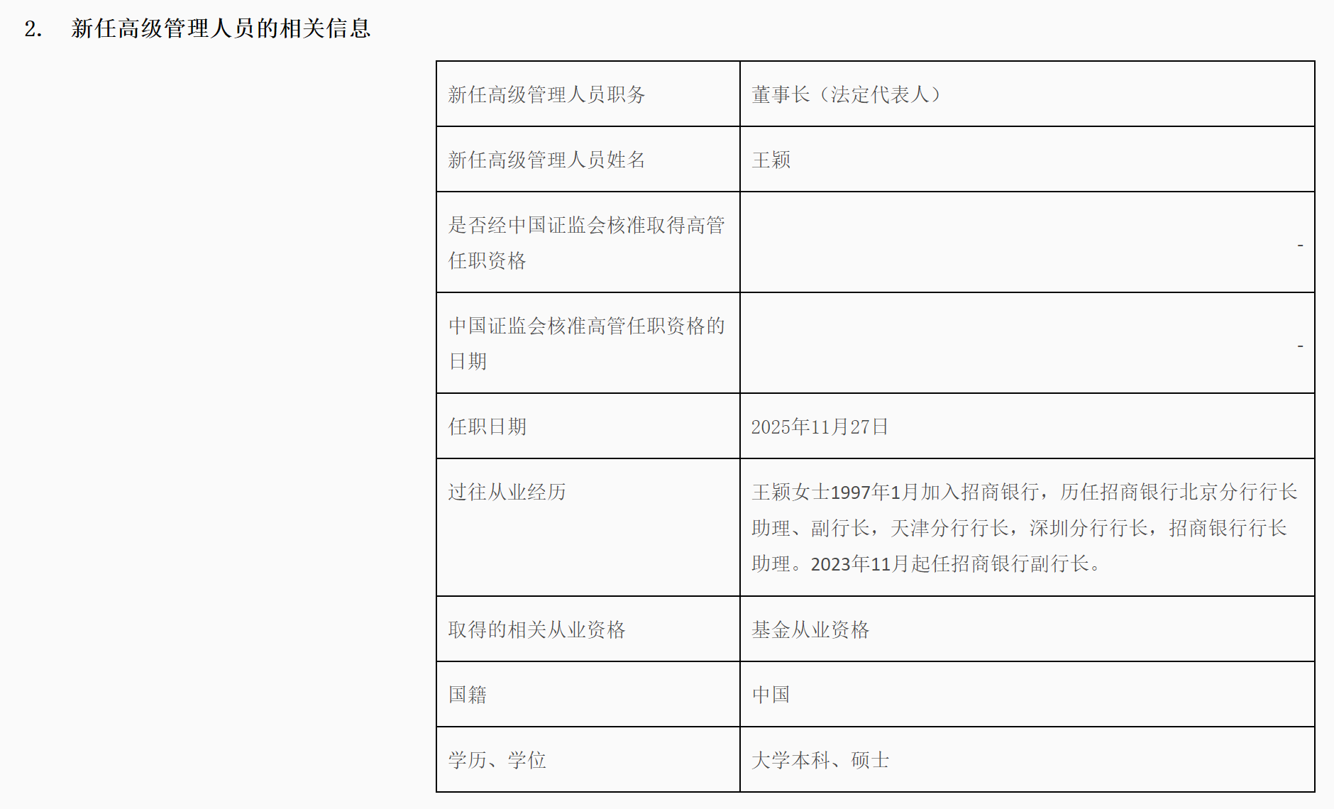 央廣網北京11月27日消息(記者 馮方)11月27日,招商基金發布公告稱,王穎自2025年11月27日起擔任公司新任董事長。上述事項,已經公司董事會會議審議通過,并按照規定向監管機構報備。