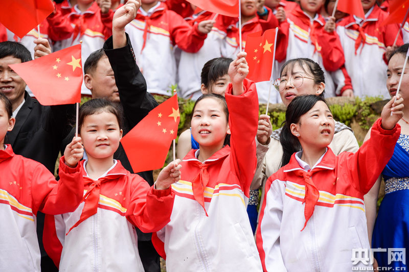 學生們揮動小紅旗(央廣網發 通訊員方華彬/攝)