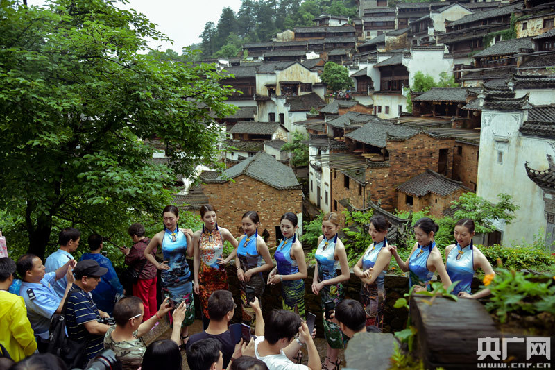 一場快閃以流動的旋律、瀟灑的畫意,展現(xiàn)女子典雅賢淑的氣質(zhì)和篁嶺靚麗綽約的風采,讓風光旗袍與秀美鄉(xiāng)村完美融合。這場“旗袍秀”也展示著中國傳統(tǒng)服飾與這古老徽州村落文化巧妙融合的無限魅力。