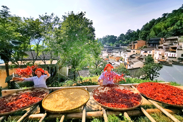 立秋將至,篁嶺古村的農(nóng)作物普遍豐收,又到了一年“曬秋”最美季。篁嶺村民們將收獲來的紅辣椒、玉米、南瓜和菊花等色彩斑斕的農(nóng)作物,晾曬在依山而建的徽派民居的曬樓上,揭開新一年曬秋紅火的序幕。(圖文/方華彬)