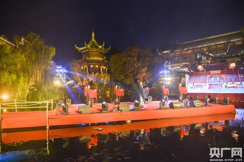 華燈初上,為戲劇表演搭建的熹園水上舞臺燈光璀璨,臨湖長凳高朋滿座。在這座穿越千年的綠意葳蕤江南園林中,所有目光聚集在流光溢彩的舞臺上,成百上千的戲曲迷早早地聚集在熹園,翹首以盼。