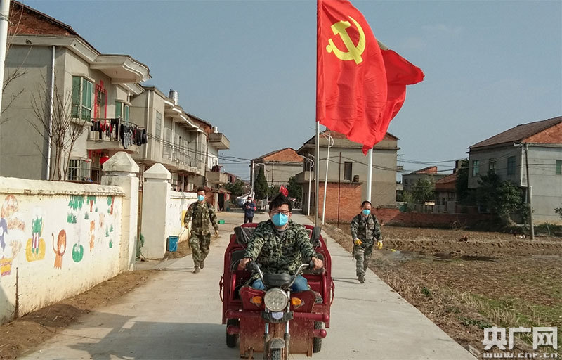 一身迷彩服、一副口罩、一輛三輪車、一面黨旗、一個消毒液噴灑器,外加一個大喇叭,今年的春節,陳東華的新春裝備格外不一樣。從1月28日(大年初四)開始,陳東華每天帶著24歲的侄子陳宇和21歲的侄子陳杰走在塘南鎮的大街小巷噴灑消毒液。