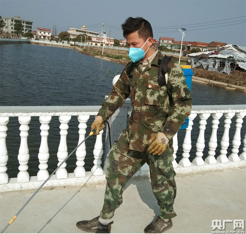 21歲的現役軍人陳杰在噴灑消毒液