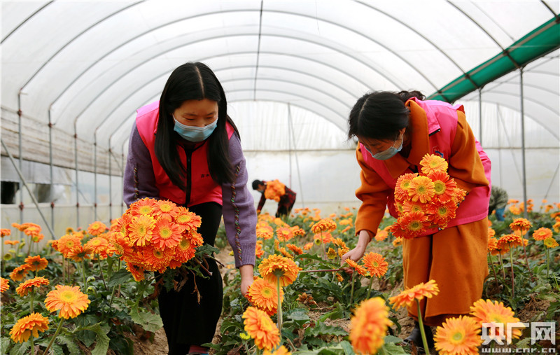 2020年3月3日,江西省吉安市吉水縣黃橋鎮沈塘村金太陽花卉基地,黃橋鎮巾幗志愿者正在幫助種植戶采摘花卉。