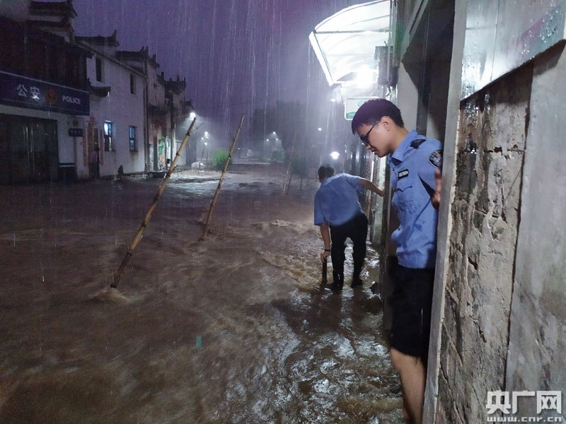 當晚7時許,沱川鄉的強降雨已持續了4個多小時,洪水造成理坑村及沿河村落被淹,村下村敬老院附近電箱損壞,學?盏乇谎蜎]。面對突發的災情,沱川派出所立即啟動防汛處置應急預案,調集全部警力,所長張小波帶隊,奔赴災區,疏通水毀道路、搶救受災財物、轉移被困群眾。