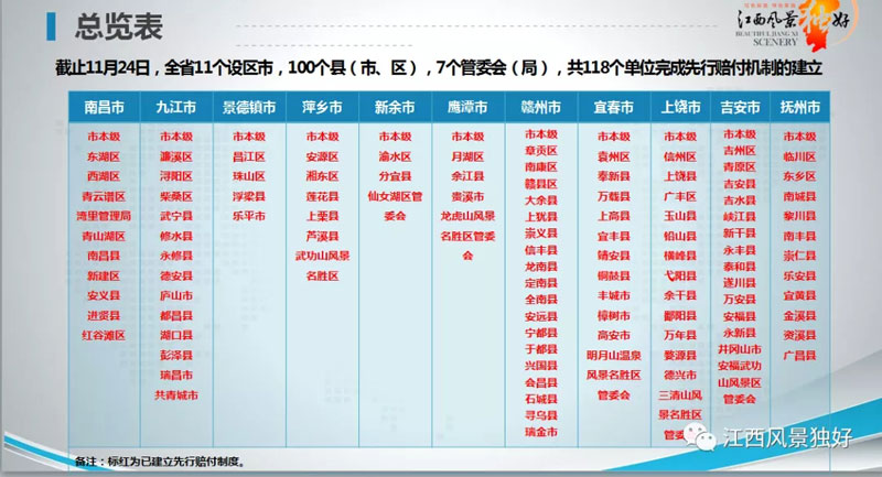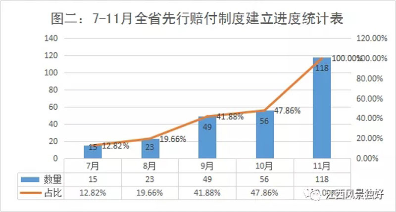 一年來,省政府及省文化和旅游廳等部門高度重視條例貫徹落實工作,先后成立了宣傳貫徹工作領導小組,及時下發(fā)了《宣傳貫徹〈江西省旅游者權益保護條例〉實施方案》,組織出版了《江西省旅游者權益保護條例釋義》,開展了“百萬網民學法律”江西省旅游者權益保護條例專場知識競賽活動,近32萬人次參與網絡答題,形成了較好的宣傳輿論氛圍。同時,各地對條例中先行賠付等重點創(chuàng)新條款進行了及時落實,如上饒市設立了總額1000萬元優(yōu)質旅游誠信理賠基金,鷹潭市在全省率先升格組建了副縣級旅游綜合執(zhí)法支隊等。截止11月24日,我省11個設區(qū)市本級、100個縣(市、區(qū))、7個管委會(局)全部建立了先行賠付制度(見圖一)。其中,7月-11月的每月建立比例逐月攀升(見圖二)。