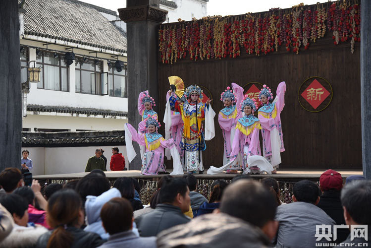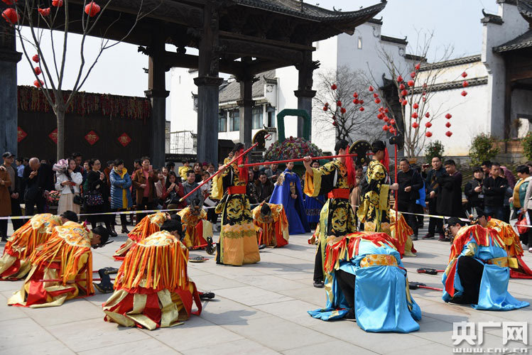婺源充分發揮豐富的非遺文化資源優勢,打造極具特色的“演藝小鎮”,推動旅游文化產業大發展,吸引了眾多游客前來觀看。3月11日,游客在婺源夢里老家演藝小鎮欣賞極具當地特色的國家級非遺項目——儺舞和徽劇表演。(央廣網發 通訊員單長華攝)