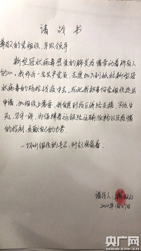 “我作為一名共產黨員,自愿加入到抵抗新型冠狀病毒的防控戰(zhàn)‘疫’中去。”1月27日,南昌客運段D736次列車員楊躍紅寫下了一封請戰(zhàn)書。