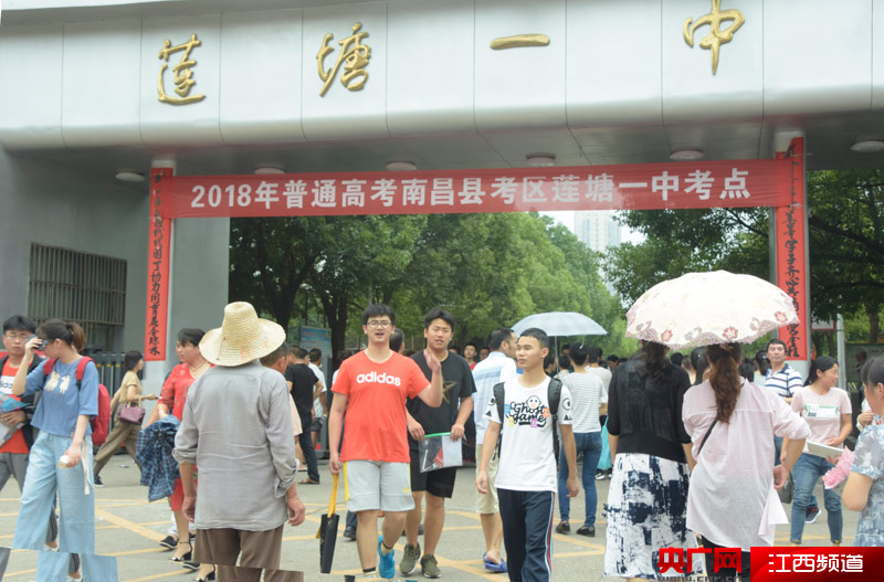 2018年6月7日高考第一天,江西省南昌縣蓮塘一中考點門口,來自該縣各個社區、公司的志愿者們準備了礦泉水等食品,遞上物品的同時,一聲聲的“金榜題名”為考生加油鼓勁。