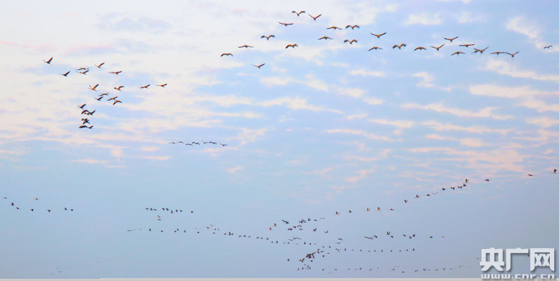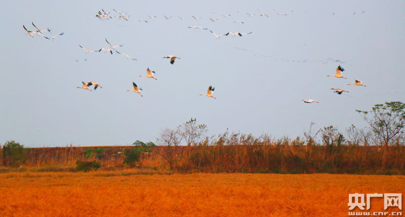 成千上萬只白鶴、白枕鶴、灰鶴在棲息覓食,嬉戲飛舞(央廣網發 通訊員供圖)