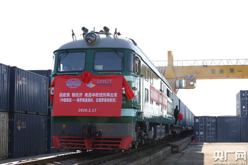 央廣網南昌2月17日消息(記者胡嘯 通訊員石閩 周娜)2月17日9時58分,滿載著41車40英尺集裝箱的中歐班列,由南昌(向塘)國際陸港橫崗站發出駛往俄羅斯莫斯科和白俄羅斯明斯克。