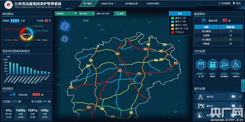 據(jù)介紹,江西高速集團養(yǎng)護管理系統(tǒng)由“養(yǎng)護數(shù)據(jù)、養(yǎng)護展示、日常養(yǎng)護、公路技術狀況、路面養(yǎng)護輔助決策分析以及BIM+VR試點應用”六大模塊組成,由江西省高速集團路網(wǎng)運營管理公司研發(fā)打造。