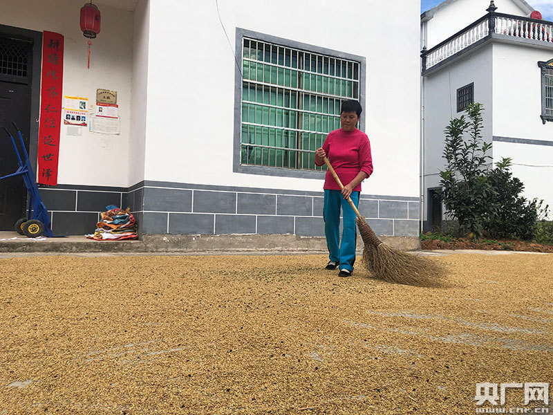 村民在家門前晾曬稻谷(央廣網記者 胡斐 攝)