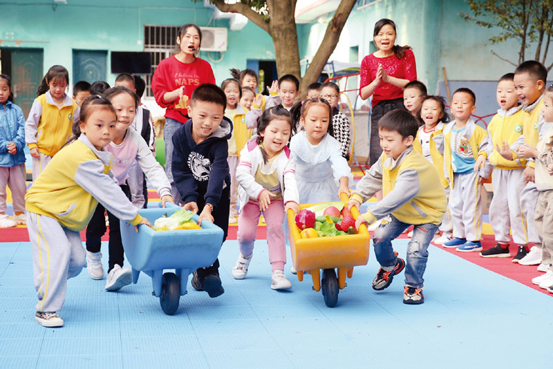 江西堅持以人民為中心的發展思想,加快教育、文化、衛生、體育等社會事業發展,更好滿足人民美好生活需要。圖為2020年10月14日,江西省峽江縣幼兒園通過參加搬運瓜果、冬瓜舉重等趣味比賽,提高孩子們熱愛勞動、愛惜糧食的意識。 人民圖片 陳福平/攝
