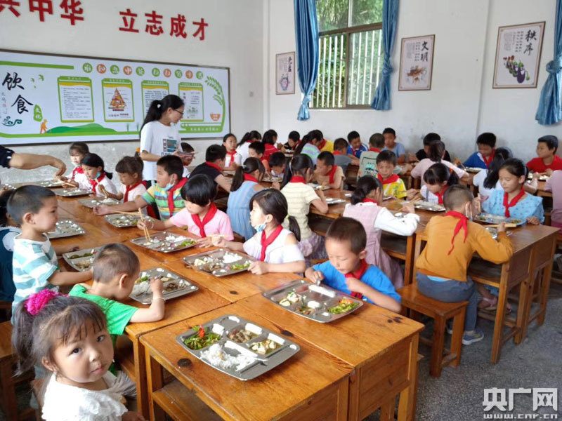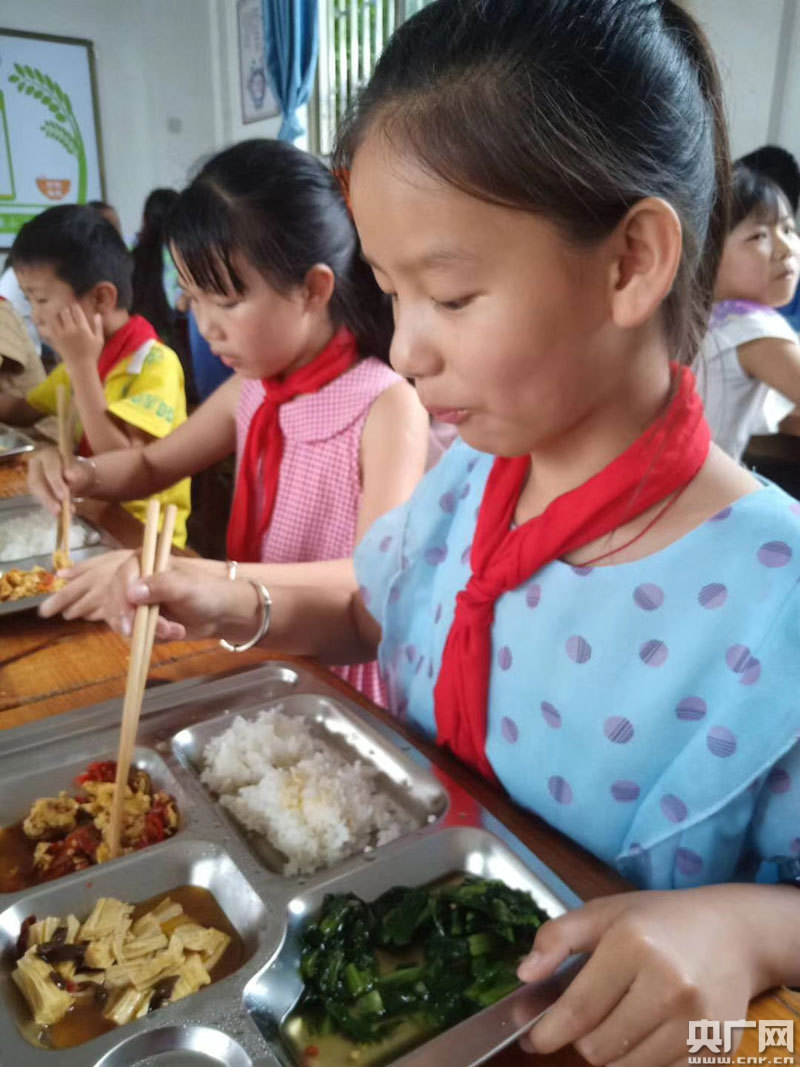 “開(kāi)飯嘍!”伴隨著食堂廚師的一聲吆喝,孩子們迅速將課桌上的書(shū)本、文具收拾干凈,接過(guò)盤(pán)子和筷子,排隊(duì)到講臺(tái)打飯。老師們負(fù)責(zé)給各自班級(jí)的孩子們打飯,平時(shí)習(xí)慣在黑板上寫(xiě)粉筆字的他們,打起飯來(lái)也毫不含糊,一邊熟練地將飯菜足量盛到孩子們的盤(pán)子里,一邊問(wèn)他們夠不夠,鼓勵(lì)他們要吃飽。