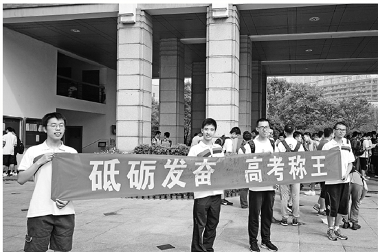 杭二中門口,已經保送的幾位同學打出“砥礪發奮,高考稱王”的標語,為同學們打氣。