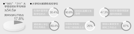 大學校長都擁有名校學位,在海外留學獲取學位的占30.4%,擁有博士學位的比例高達89.4%,90.8%的校長是博士生導師,中國科學院和中國工程院院士占26%。63%的大學校長理工科出身,其中管理學背景的校長占10.9%,教育學背景的校長僅占4.3%。校長所在學科位列國務院學位委員會學科排行榜中的平均位次為17位,他們大部分是校內和學科領域的權威,47.3%的校長曾獲得國家級科技獎勵。