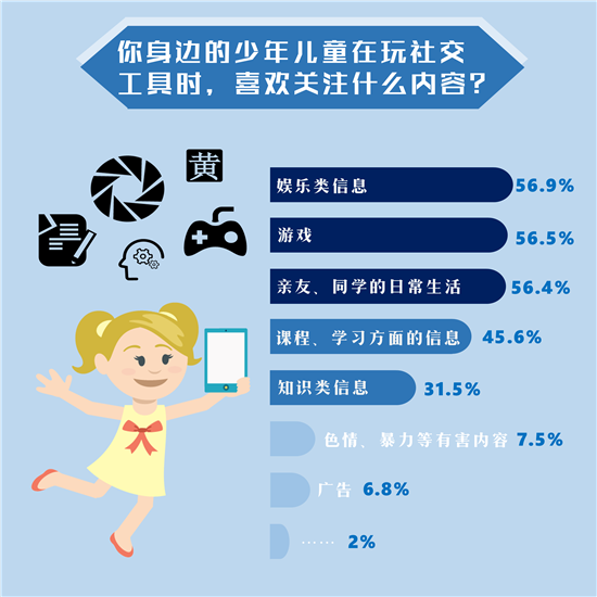 調查中,7.5%的受訪者發現有兒童在瀏覽網絡社交工具中的色情、暴力等有害內容,6.8%的受訪者發現有兒童愛看網絡社交工具上的廣告。