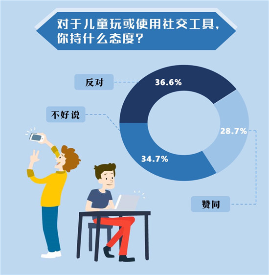 近日,中國青年報社會調查中心通過問卷網,對2001人進行的一項調查顯示,81.4%的受訪者坦言自己身邊使用網絡社交工具的兒童多。據受訪者觀察,在網絡社交工具上,孩子們最喜歡關注的3種內容是:娛樂類信息(56.9%)、游戲(56.5%)以及親友、同學的日常生活(56.4%)。對于兒童使用網絡社交工具,36.6%的受訪者表示反對,僅28.7%的受訪者表示支持。