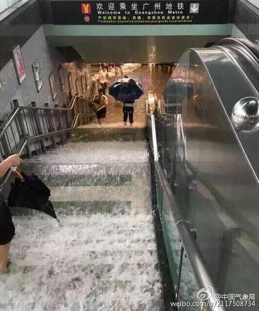 廣州暴雨公交內(nèi)水流成河 雨水倒灌地鐵成瀑布