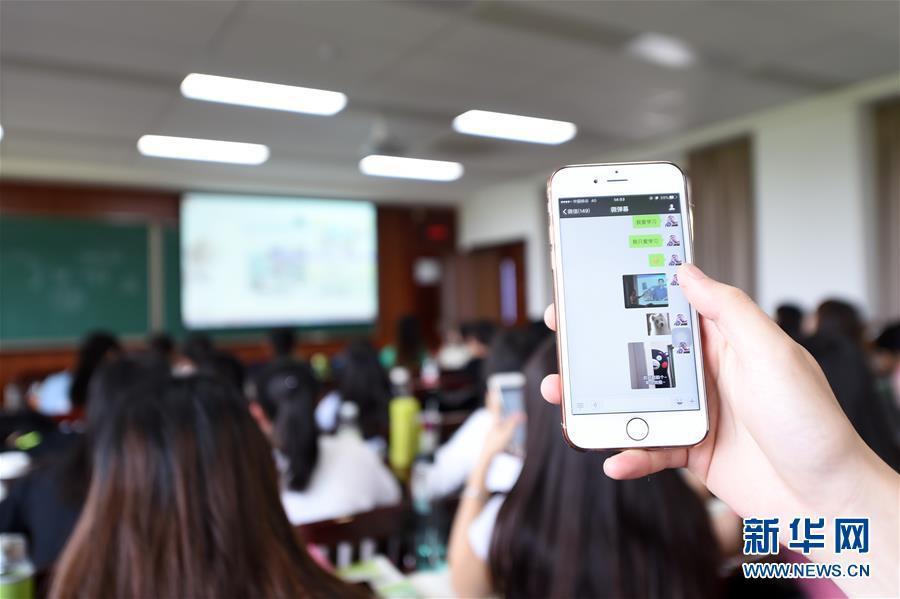 5月24日,一位同學(xué)在展示其通過微信“彈幕”發(fā)給老師和投影儀的內(nèi)容。重慶大學(xué)新聞學(xué)院大二選修課《網(wǎng)絡(luò)與新媒體》放棄傳統(tǒng)課前點(diǎn)名方式,通過微信對(duì)學(xué)生進(jìn)行定位簽到。課程通過微信記錄下的定位簽到記錄和課堂測(cè)驗(yàn)記錄都將在期末折算成平時(shí)成績(jī)。該選修課授課老師還通過微信進(jìn)行課堂教學(xué),允許學(xué)生在課堂上隨時(shí)通過微信“彈幕”提問并與老師互動(dòng)。新華社記者 唐奕 攝 圖片來(lái)源:新華網(wǎng)