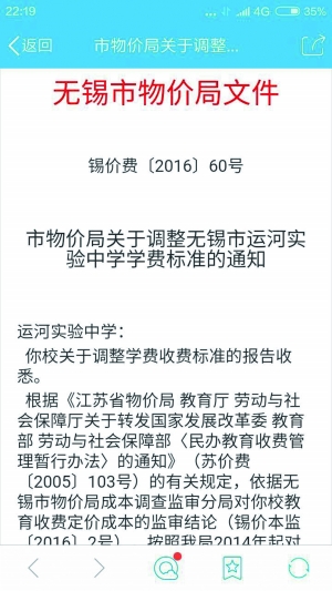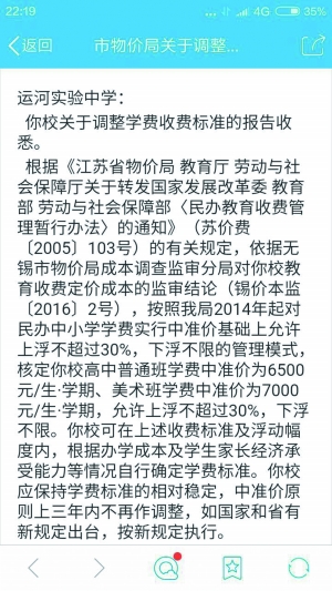 現代快報記者在網上搜了搜,無錫市物價局今年核定的運河中學的收費標準如下:“普通班”6500元/生·學期,“美術班”7000元/生·學期,允許上浮不超過30%,下浮不限。但對照該校招生辦給出的收費,無論是“精品班”還是“12人小班”,均大大超標。記者當即將此事反映給無錫市物價局價格舉報熱線,相關人員表示會盡快聯系處理。