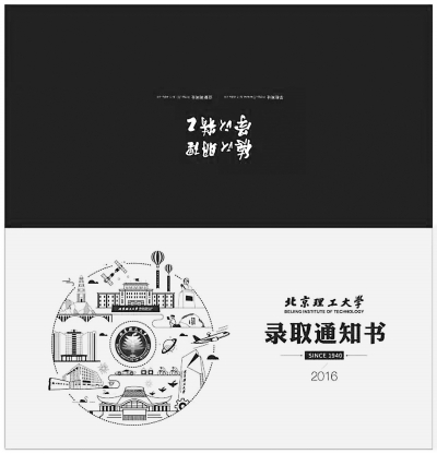 北京工業大學今年專門請來該校工業設計專業學生設計通知書。在通知書封套正面,北工大的科學樓、第二教學樓、圖書館等標志性建筑圍繞校徽呈圓形排列,遠遠看去,猶如盛放的花朵,底紋則是北工大藍顏色的豎條紋,看上去端莊素雅。今年校園開放日期間,北工大還組織了“VIP家長團”,邀請前來參觀的家長為自己的孩子寫封信留在招辦。如果孩子成功考上北工大,這封信將連同錄取通知書一同寄出,成為他考上大學后的第一封家書。