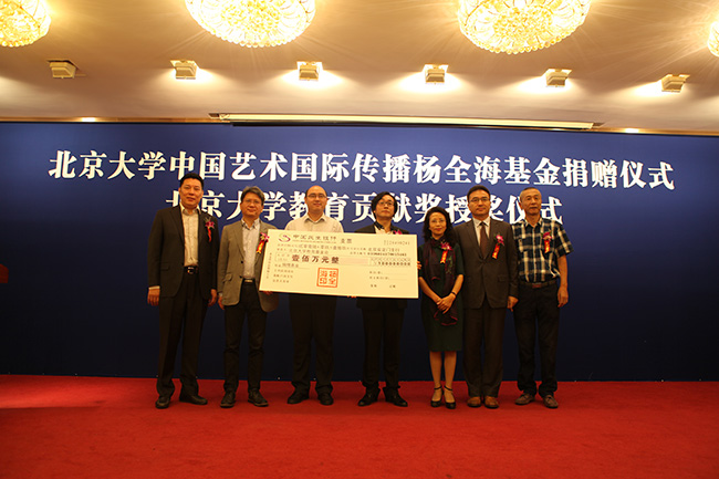 為了推動中國藝術的發展與傳播,特別是促進中國藝術的國際傳播,北京藝海影杰國際文化傳播中心董事長楊全海博士慷慨捐贈100萬元人民幣,用以資助北京大學藝術學院開展中國藝術國際傳播理論研究和人才培養。北京大學教育基金會胡俊副秘書長代表北京大學接受捐贈并授予楊全海博士“北京大學教育貢獻獎”,用以表彰楊全海博士對教育事業和公益事業的貢獻,以及對北大學子和中國藝術國際傳播的深深關愛和關注。