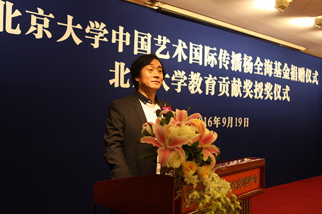 北京藝海影杰國際文化傳播中心董事長楊全海博士隨后講話,他說:作為一位一直在國際交流的舞臺上游走的中國藝術國際傳播的踐行者,有機會在北京大學設立一項專屬基金心情是澎湃的,北京大學作為中國文化傳承與創新的學術之地,希望這只基金的設立能激發更多的人投身到中國文化藝術的傳播中,發現、發掘、研發出更多、更好的作品向世界展示中國文化藝術的獨特魅力。作為東北師范大學畢業生,盡管沒有從事基礎教育工作,這些年卻一直心系教育,因為他堅信民族的富足、國家的強盛與育人是分不開的,而教育是個系統的工程,這次捐助北京大學,就是希求以星火之力點燃起中國藝術國際傳播的燎原之勢!