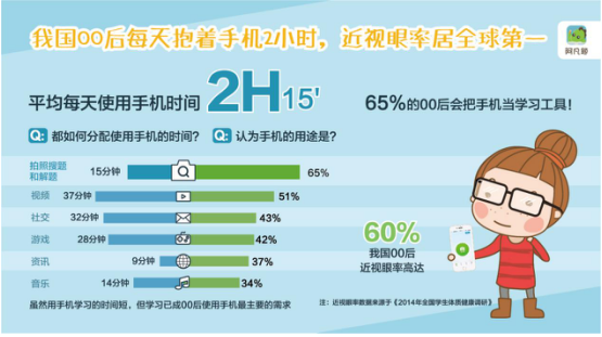 著名雕塑家羅丹曾說“世界上并不缺少美,而是缺少發現美的眼睛”,可放在當今中小學生群體中,缺少的卻是一副近視眼鏡。阿凡題《學習行為報告》顯示,我國00后近視眼率高達60%,居全球第一。而他們平均每天使用手機時間長達2小時15分鐘,其中平均刷視頻37分鐘、網上聊天32分鐘、打游戲28分鐘、上網拍照搜題15分鐘,聽音樂和看新聞則分別占用14分鐘和9分鐘。但調研顯示,使用時間長短并不與00后的使用需求直接相關。如雖然平均每天只花15分鐘進行拍照搜題搞定作業,卻有65%的00后都會選擇把手機當作學習工具,換言之,學習已成為00后使用手機最主要的需求。
